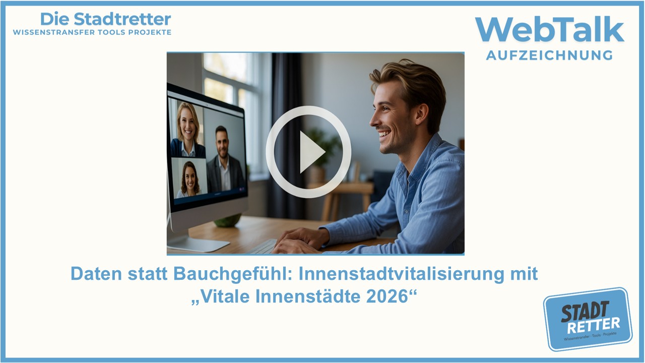 Im WebTalk zeigt Dr. Markus Preißner vom IFH KÖLN anhand der langjährig durchgeführten Untersuchung „Vitale Innenstädte“, wie Kommunen relevante Daten lokal erheben, sinnvoll interpretieren und in konkrete Maßnahmen übersetzen können. Du erfährst, welche Kennzahlen wirklich aussagekräftig sind, wie Du Trends frühzeitig erkennst und wie datenbasierte Entscheidungen den Austausch mit Politik, Handel, Immobilienwirtschaft und weiteren Stakeholdern stärken.